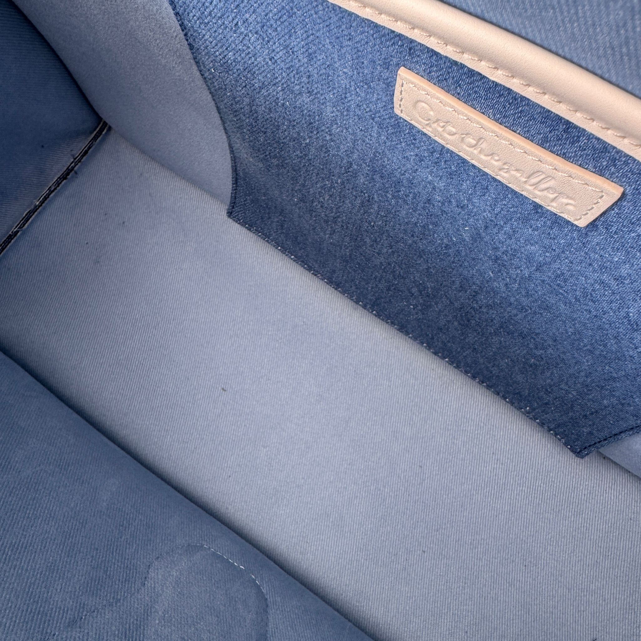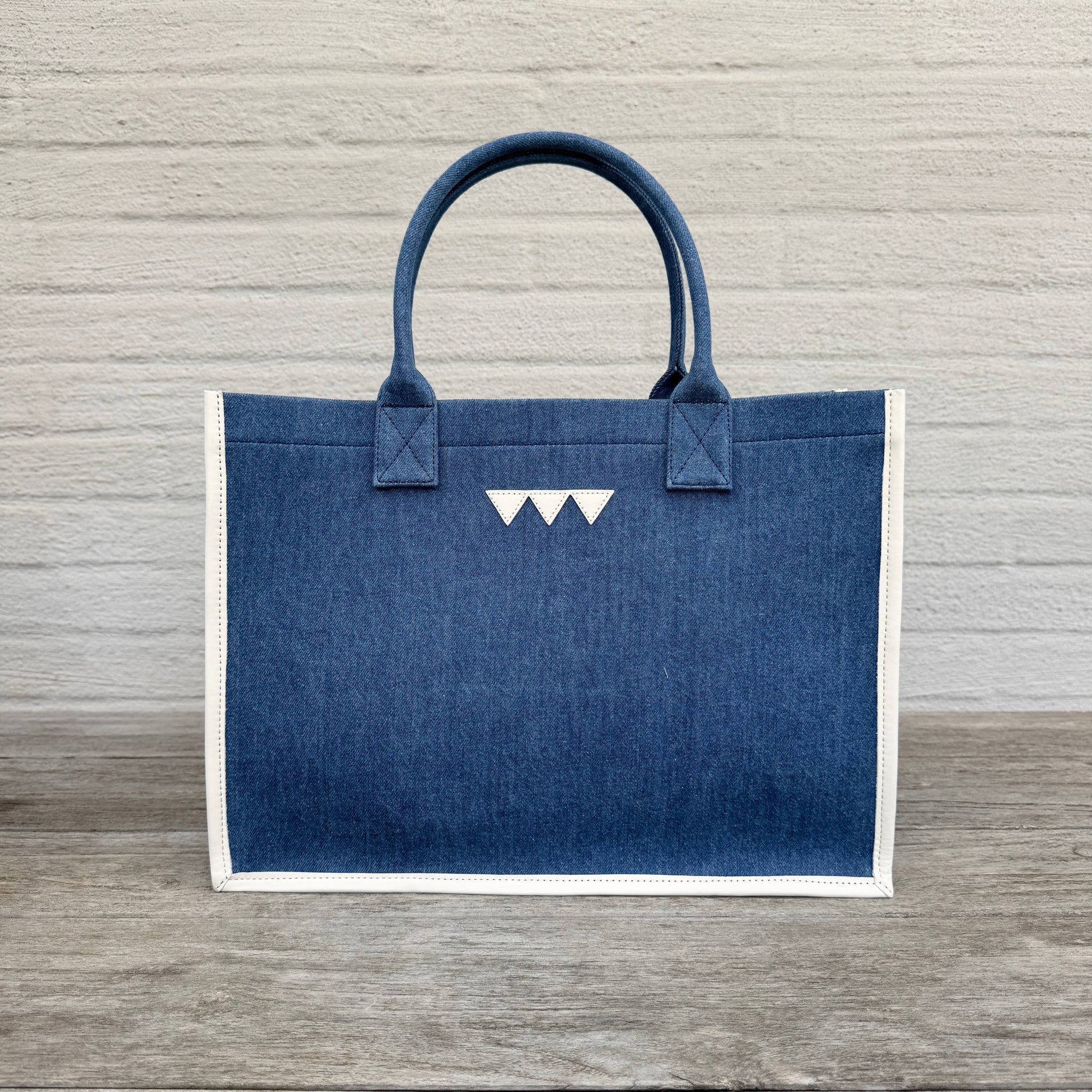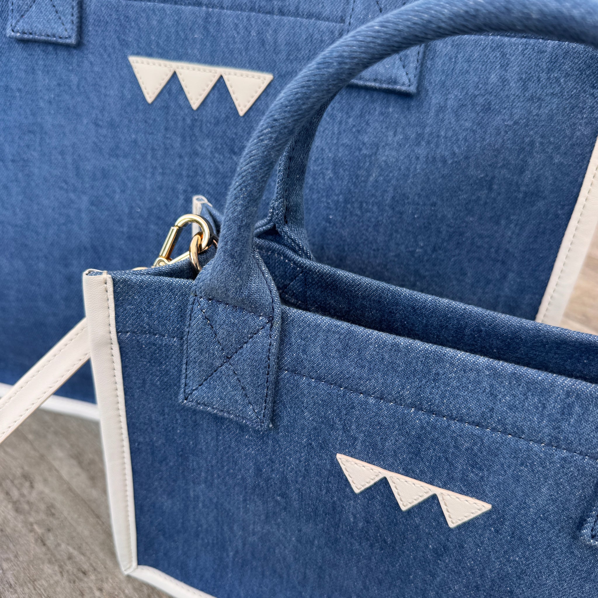 Made from durable blue cotton denim with crisp white leather details, it blends casual cool with a touch of structured elegance. A small inner pocket keeps your keys or phone easy to reach.