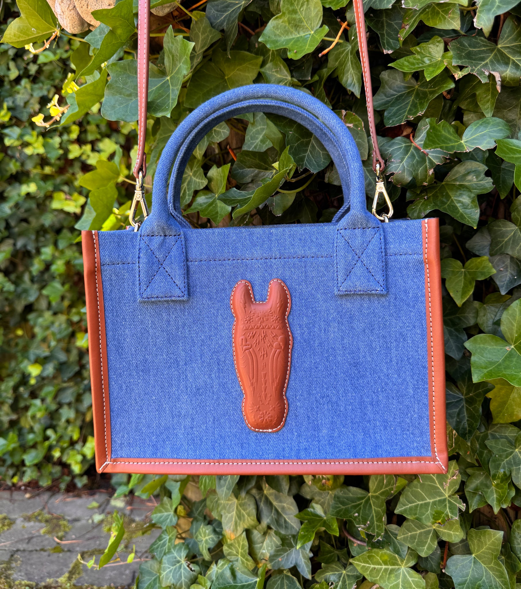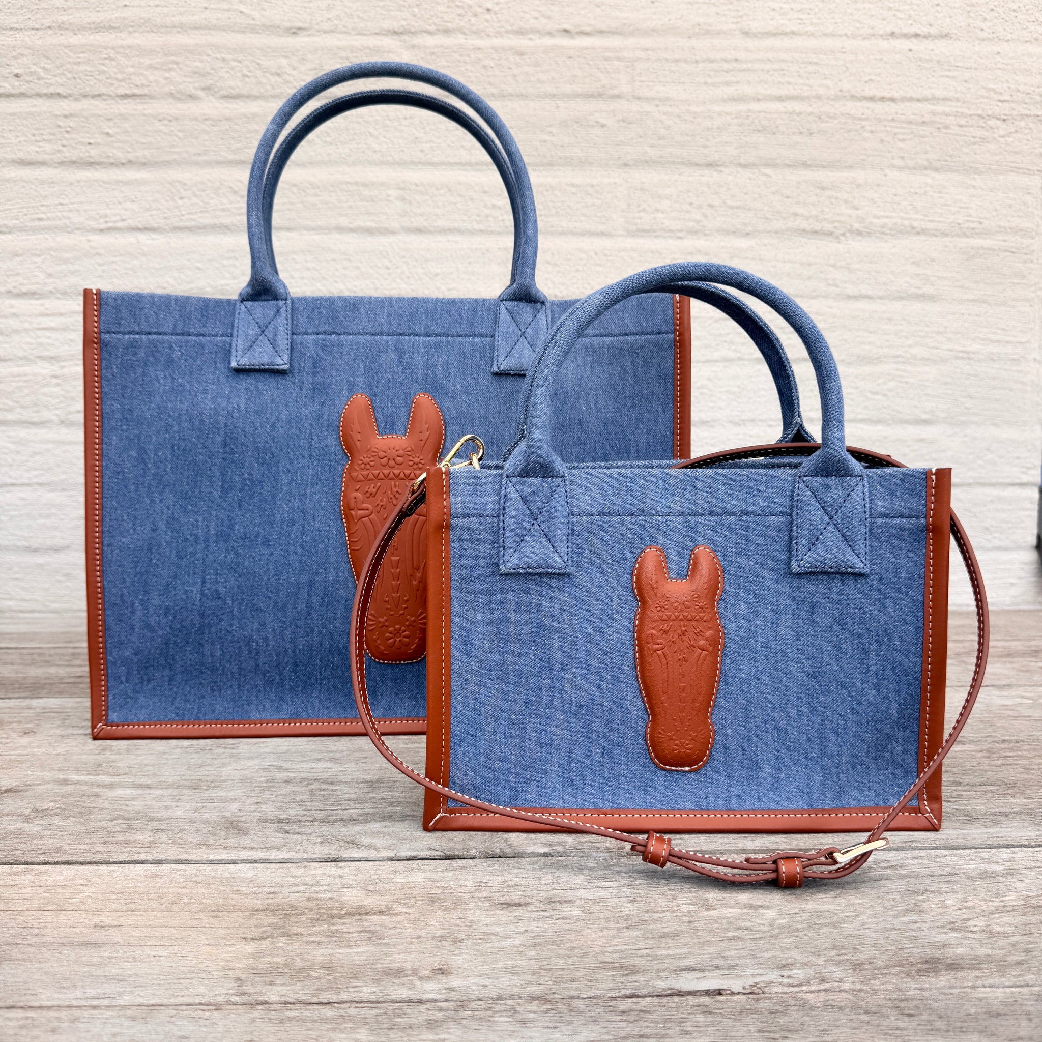 The Horse Lovers Unite tote bag are made from blue cotton denim with brown leather details. The two bags are a perfect combo. One small for phones, sunglasses, a keep cup and other small essentials (plus a bag strap to carry it easily as a crossbody bag)  and one Large bag which is perfect as a work bag (computer and notes), beach bag (towels and suncream) or just a day out and about when you need to pack a bit extra