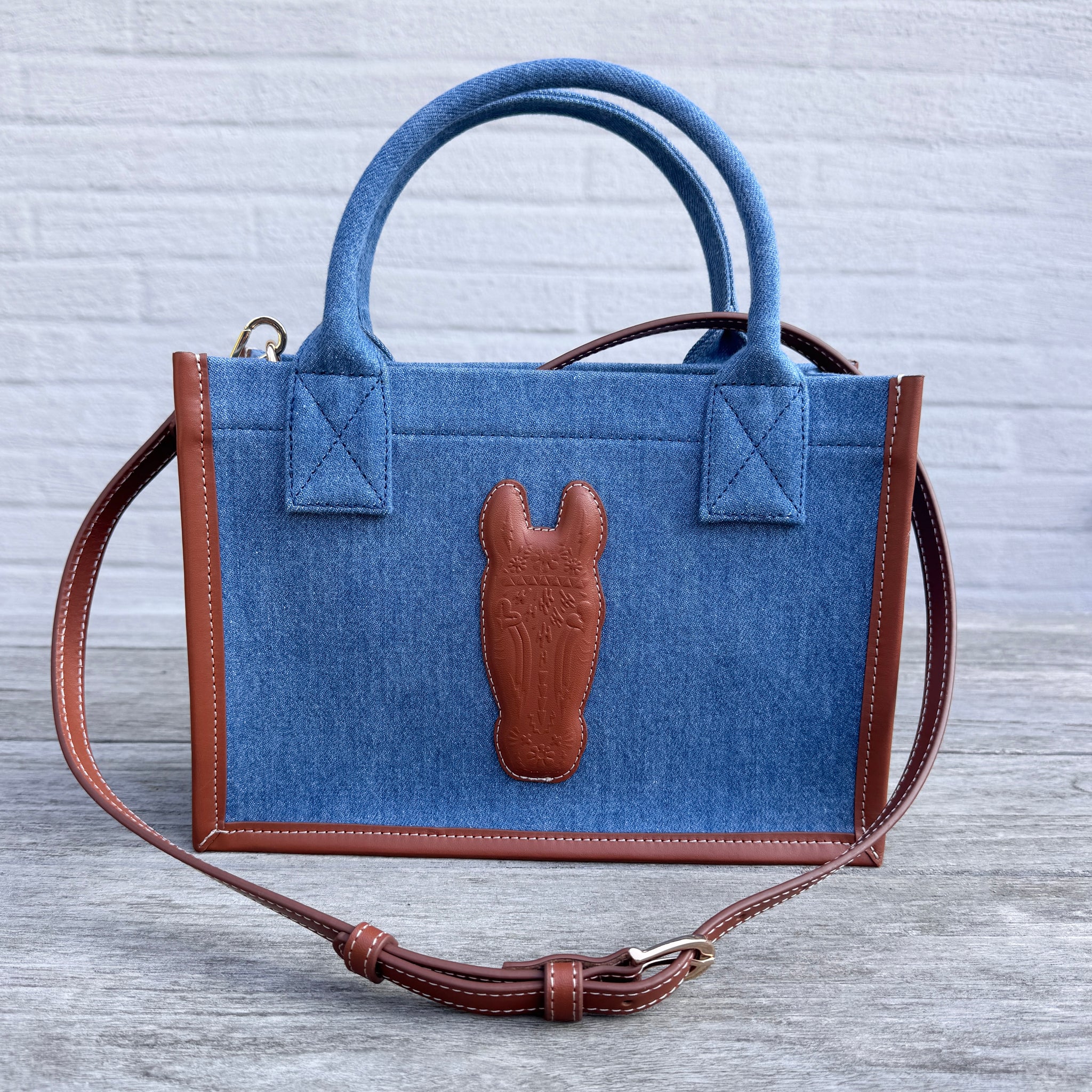 Made from durable blue cotton denim with crisp white leather details, this compact handbag features both form and function. It includes an adjustable leather crossbody strap, a small inner pocket, and thoughtful equestrian design touches on both sides: