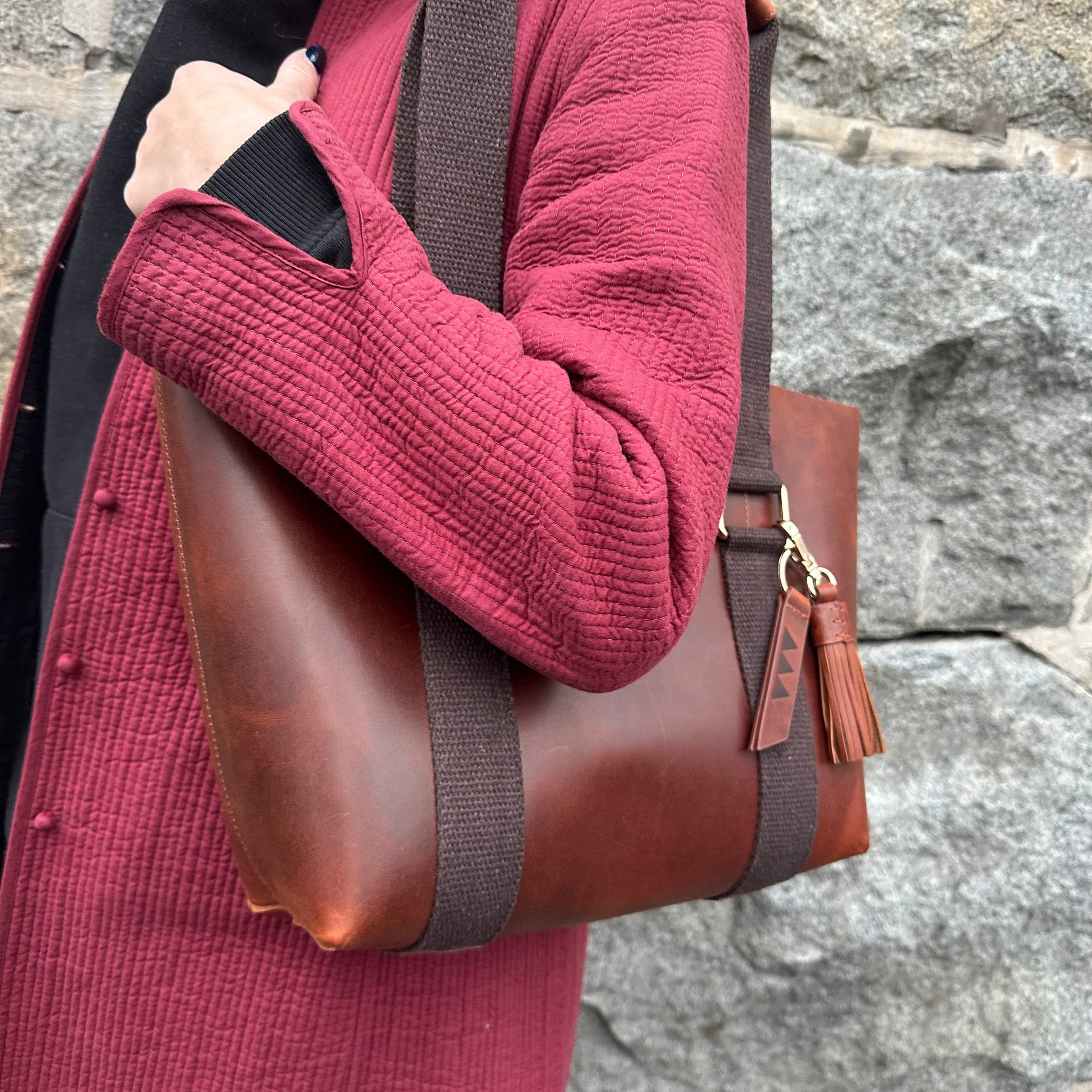 Smaller (obviously) than Medium, this brown shoulder bag fits your laptop easily so perfect for work and school. A perfect Hay Bag for those of you who think our Medium size is a bit too roomy and big, we all know how it is with big bags, they fill up and get quite heavy. The new Hay Bag Small is our solution! Get ready and go go go! This soft brown