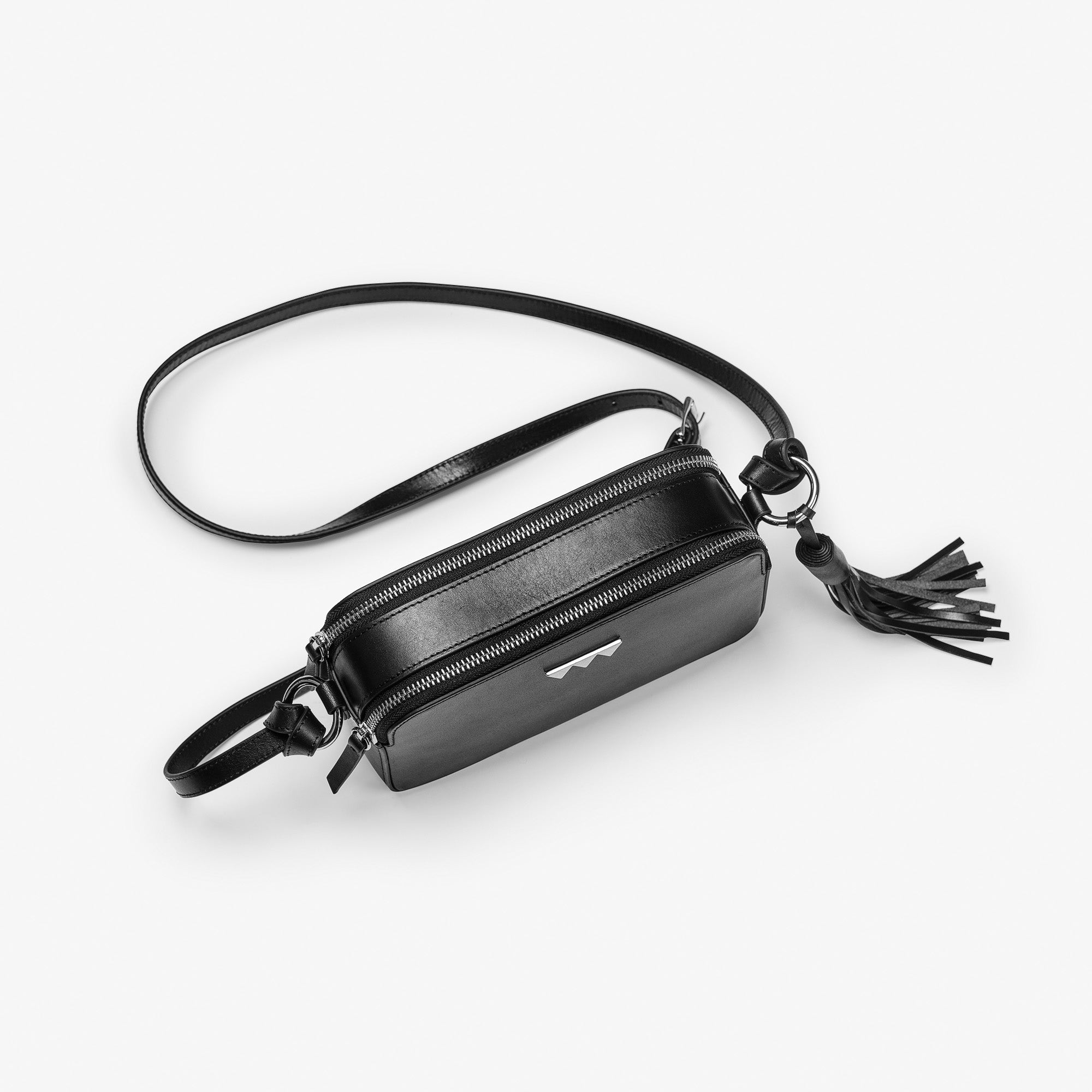 Vår nya uppdaterade Double Zip-väska är en elegant och liten crossbody-väska i svart läder. Det är en snygg liten praktisk väska som trots sin storlek rymmer allt det nödvändigaste.